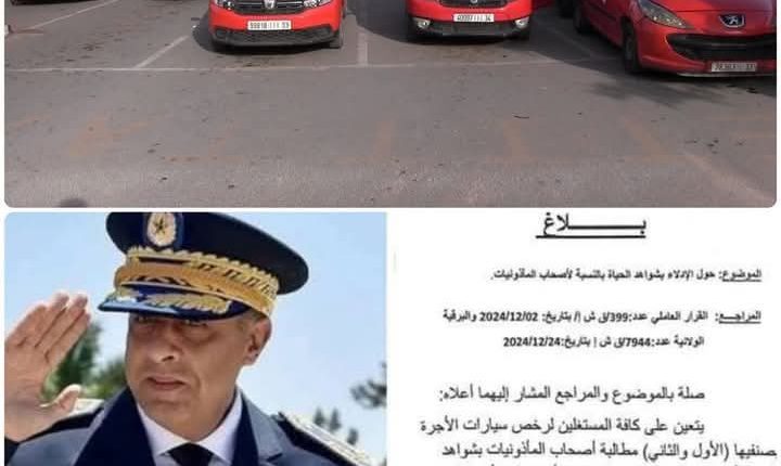 بناءً على القرار العاملي رقم 399 ق.ش بتاريخ 2024/12/02، والبرقية الولائية رقم 7944/ق.ش بتاريخ 2014/12/24، أعلنت المديرية العامة للأمن الوطني أنه يتعين على جميع مستغلي رخص سيارات الأجرة بصنفيها الأول والثاني تقديم شهادة حياة حديثة لصاحب المأذونية أو إشهاد من المستغلين يؤكد أن صاحب المأذونية لا يزال على قيد الحياة. يجب استيفاء هذا الإجراء قبل تاريخ 2025/01/31، مع التنبيه إلى أنه سيتم سحب المأذونية في حال التأخر عن الموعد المحدد.