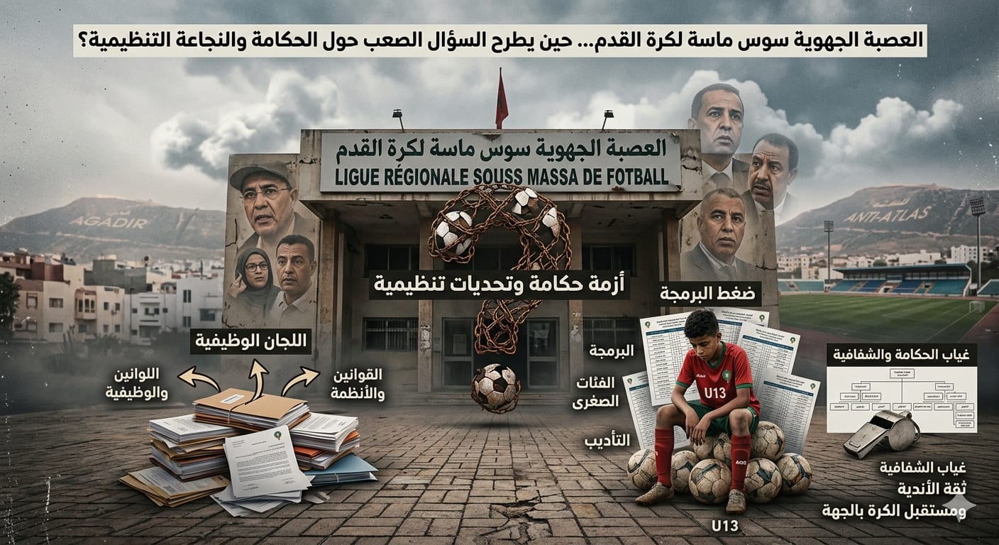 في الوقت الذي يفترض فيه أن تكون العصبة الجهوية سوس ماسة لكرة القدم نموذجاً يحتذى به في التنظيم والحكامة الرياضية بما يعكس دينامية الكرة الوطنية ويخدم بالأساس الفئات الصغرى باعتبارها خزّان المستقبل يطفو على السطح واقع يثير الكثير من علامات الاستفهام حول أداء عدد من اللجان الوظيفية وسط حديث متزايد عن اختلالات في منهجية التدبير وارتباك في اتخاذ القرار وهو ما أصبح ينعكس بشكل مباشر على السير العام للمنافسات وعلى ثقة الأندية في المنظومة ككل.