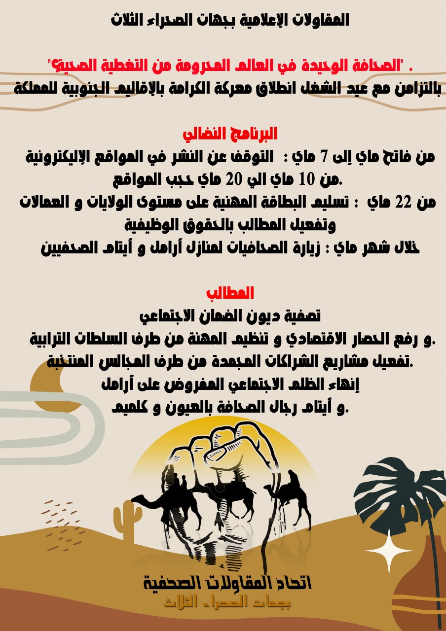 بالتزامن مع عيد الشغل تدشن المقاولات الإعلامية الصغرى معركة الكرامة بالإقاليم الجنوبية للمملكة، في ظل حرمان رجال الإعلام و عائلتهم من الحماية الاجتماعية و للتغطية الصحية، و بعد مقاضاة صندوق الضمان الاجتماعي لعدد من المقاولات.